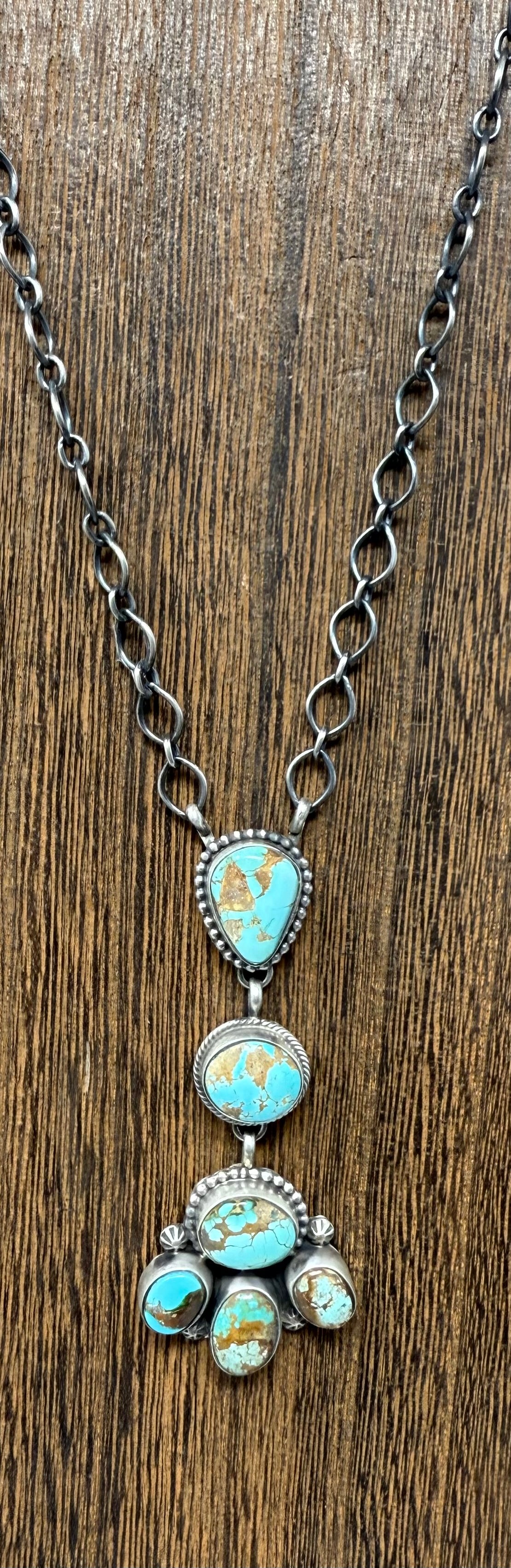 Lorenzo Juan Royston Turquoise Lariat with a beautiful cluster to accentuate the matrix of the stones. On a 19" adjustable handmade chain with a 3" drop of Royston.